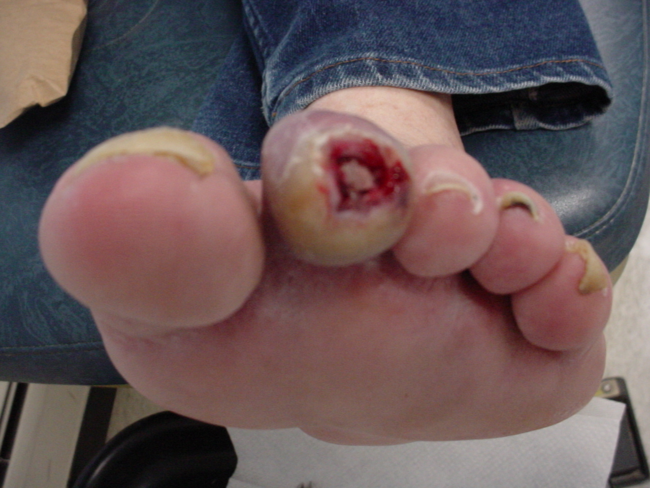 lt in a loss of sensation. A diabetic patient may step on a needle or other object in the shoe and not even be aware of the problem due to reduced sensation. The skin will eventually break down and result in an ulceration.