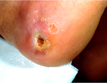 There are many types of ulcers including those caused by loss of sensation of the skin, decreased blood flow, pressure to a specific area of the foot and